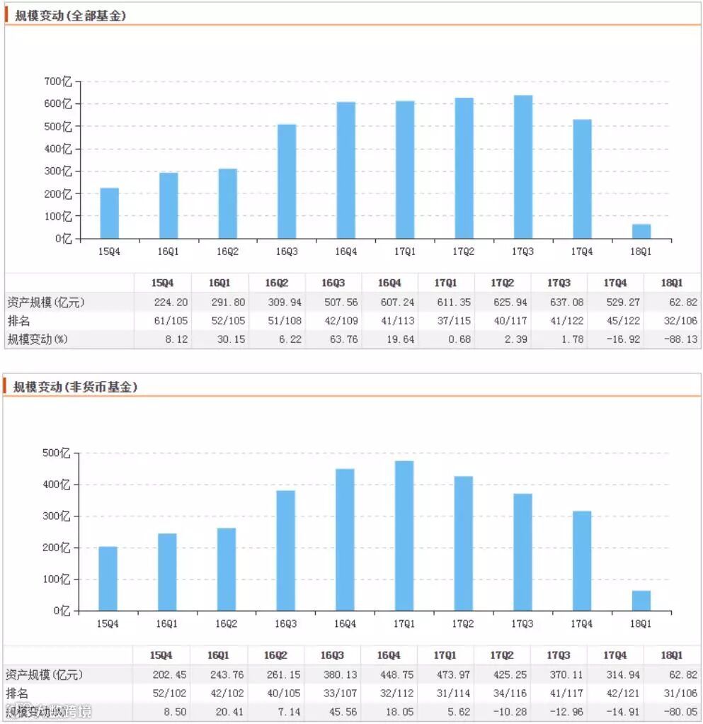 翻开前海开源沪港深汇鑫A2017年年报,我们发现该基金业绩表现低迷,去年基金份额净值增长率为5.95%,同期业绩比较基准收益率为14.79%,远远跑输基准。分季度看,2017年一季度,该基金回报率为6.60%,跻身同类前1/4;然而到了二季度,该基金回报率为-0.26%,为同类后1/4,名次直线下滑;2017年第三季度、第四季度,该基金回报率依次为0.52%、-0.87%,均在同类中业绩垫底。显然,业绩的陡然下降成为机构甩卖该基金的主要原因。