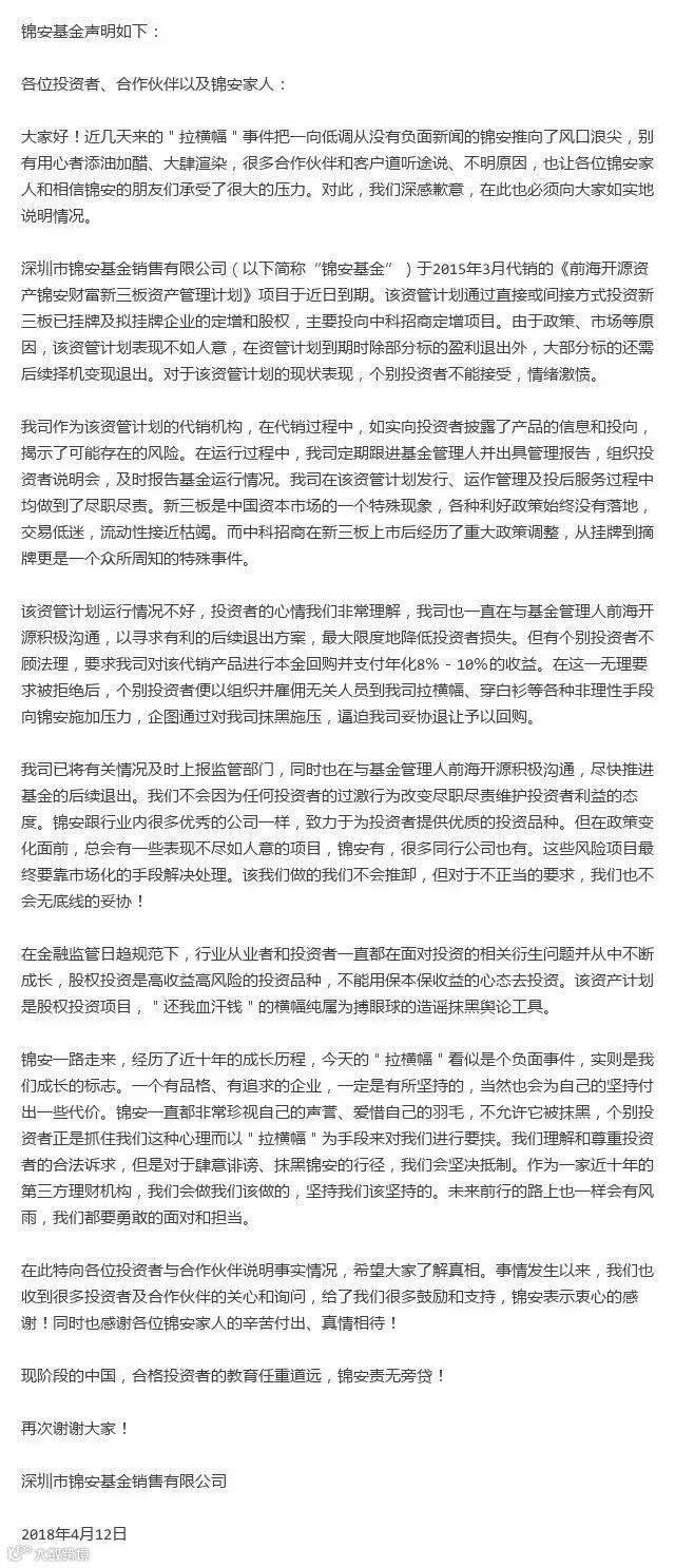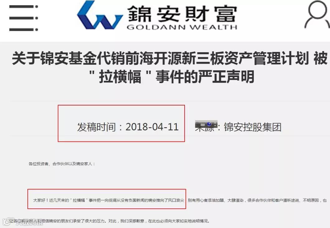 事实上,早在4月11日,该资管计划的代销机构——锦安基金,就发布声明称:“近几天来的"拉横幅"事件把一向低调从没有负面新闻的锦安推向了风口浪尖,别有用心者添油加醋、大肆渲染,很多合作伙伴和客户道听途说、不明原因,也让各位锦安家人和相信锦安的朋友们承受了很大的压力。”