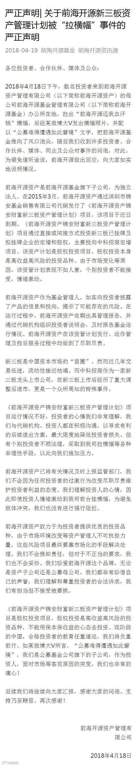 昨日,前海开源基金的办公场所被投资者拉出“前海开源还我血汗钱”横幅,晚间被微博大V转发,引起市场关注。