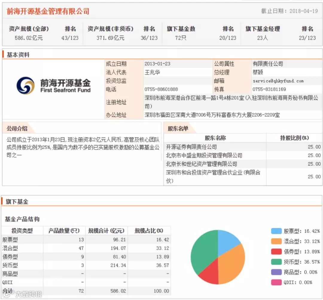 前海开源基金成立于2013年1月23日,现注册资本2亿元人民币。根据东方财富Choice统计,截至目前,公司旗下资管管理规模合计586.02亿元,全行业排名第43位;非货币资管规模为371.69亿元,全行业排名36位。旗下基金共有72只。货币型和混合型规模占比最大,分别为36.57%和33.12%。