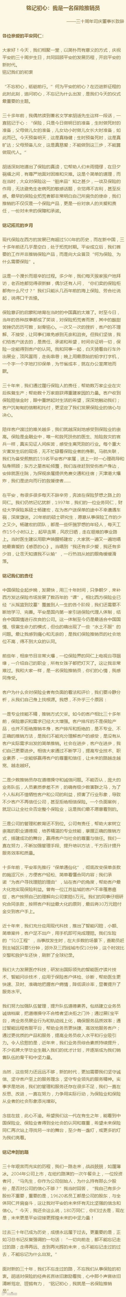 “三十多年前,我偶然读到著名文学家胡适先生这样一段话,一直铭记于心:‘保险,只是今日做明日的准备,生时做死时的准备,父母做儿女的准备,儿女幼小时做儿女长大时准备,如此而已。今天预备明天,这是真稳健;生时预备死时,这是真旷达;父母预备儿女,这是真慈爱;不能做到这三步,不能算做现代人。”