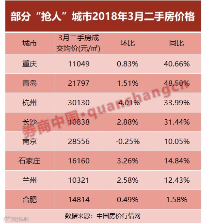 券商中国记者梳理部分“抢人”城市最新房价数据发现,今年3月重庆、青岛、杭州、长沙等城市的二手房价格已较去年同期增长了30%以上。
