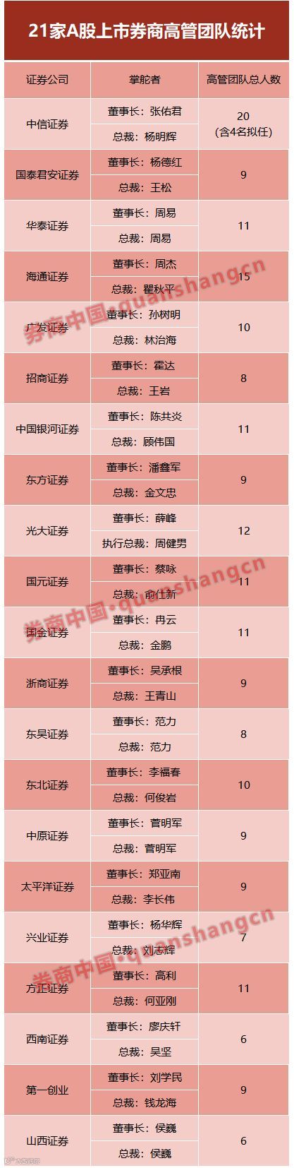 券商中国记者统计,21家A股上市券商中,中信证券、华泰证券、海通证券、广发证券、中国银河证券、光大证券、国元证券、国金证券、东北证券、方正证券等券商的高管团队人数均超过10人。