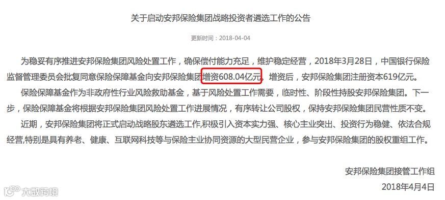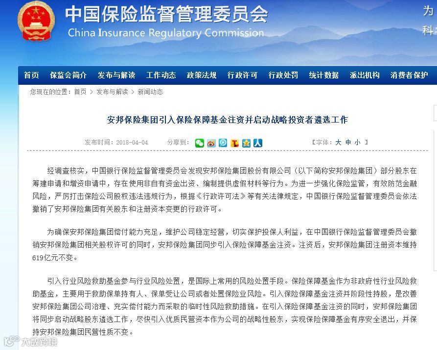 4月4日,朋友圈被一则信息刷了屏——安邦保险集团引入保险保障基金注资并启动战略投资者遴选工作。消息来自银保监会和安邦接管工作组的两则公告。