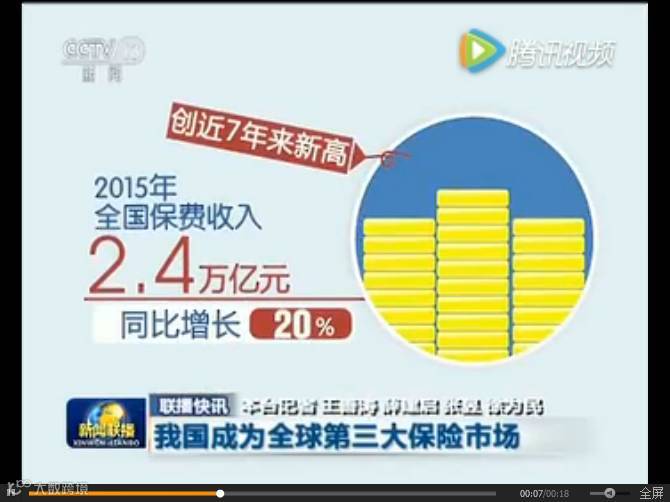 保监会今天发布,2015年全国保费收入为2.4万亿元,同比增长20%,行业发展速度创近7年来新高。十二五期间,我国保险市场规模全球排名由第6位升至第3位。
