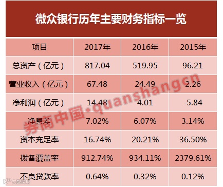 最后,微众银行的资产规模有多大?截止至2017年末,微众银行总资产规模达到817.04亿元,同比2016年的519.95亿元,增加了297.09亿元。