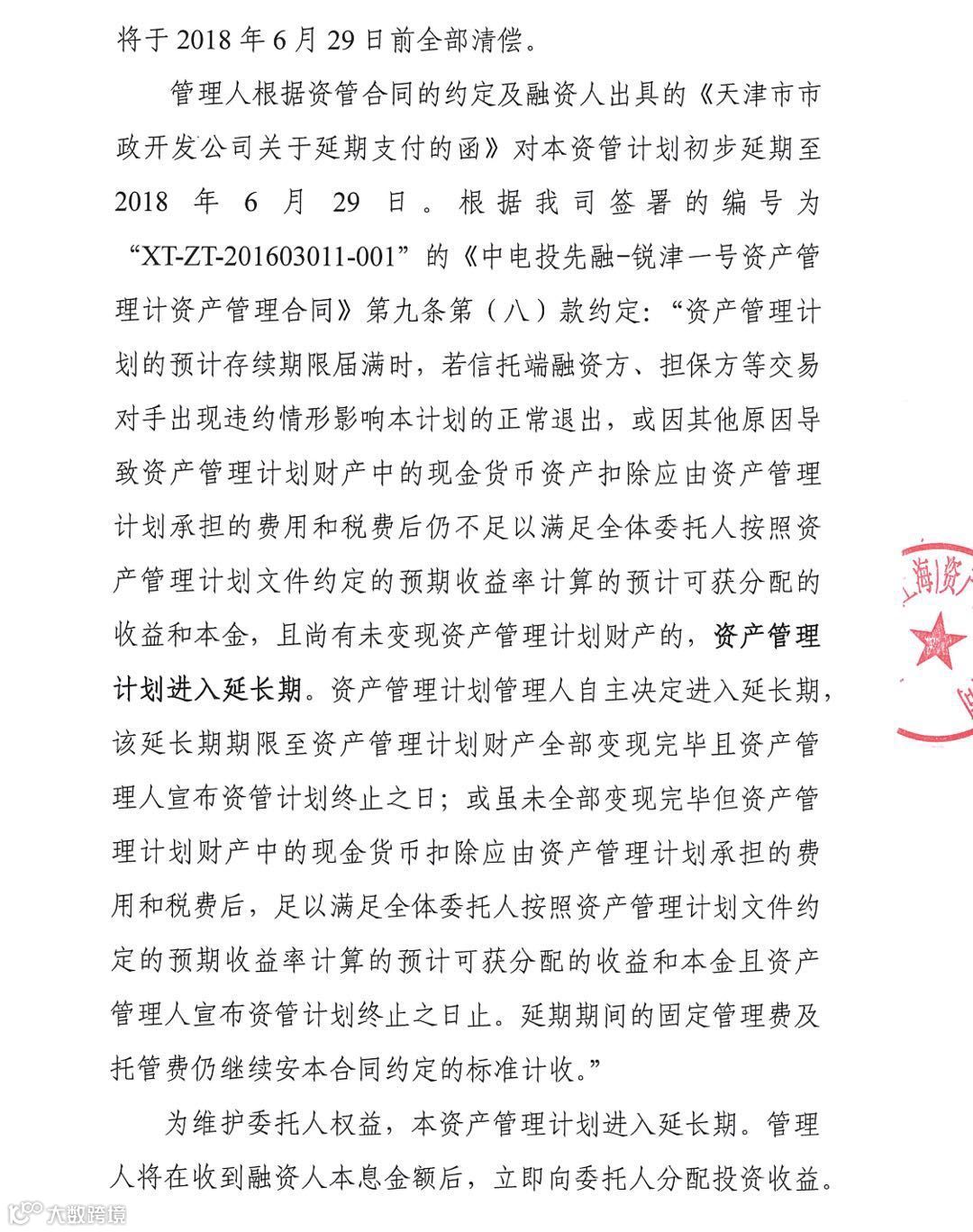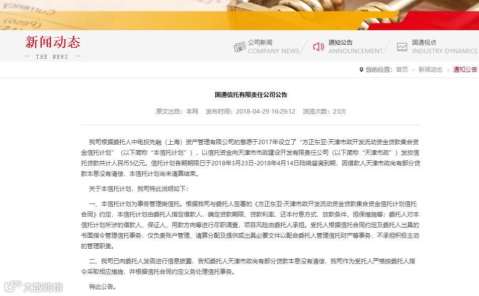 国通信托表示,根据委托人中电投先融的意愿在2017年设立了“方正东亚·天津市政开发流动资金贷款集合信托计划”,以信托资金向天津市政发发放了信托贷款共计5亿元,信托计划各期限已于2018年3月23日至4月14日陆续届满到期,因借款人天津市政开发尚有部分贷款本息没有清偿,该信托计划尚未清算结束。