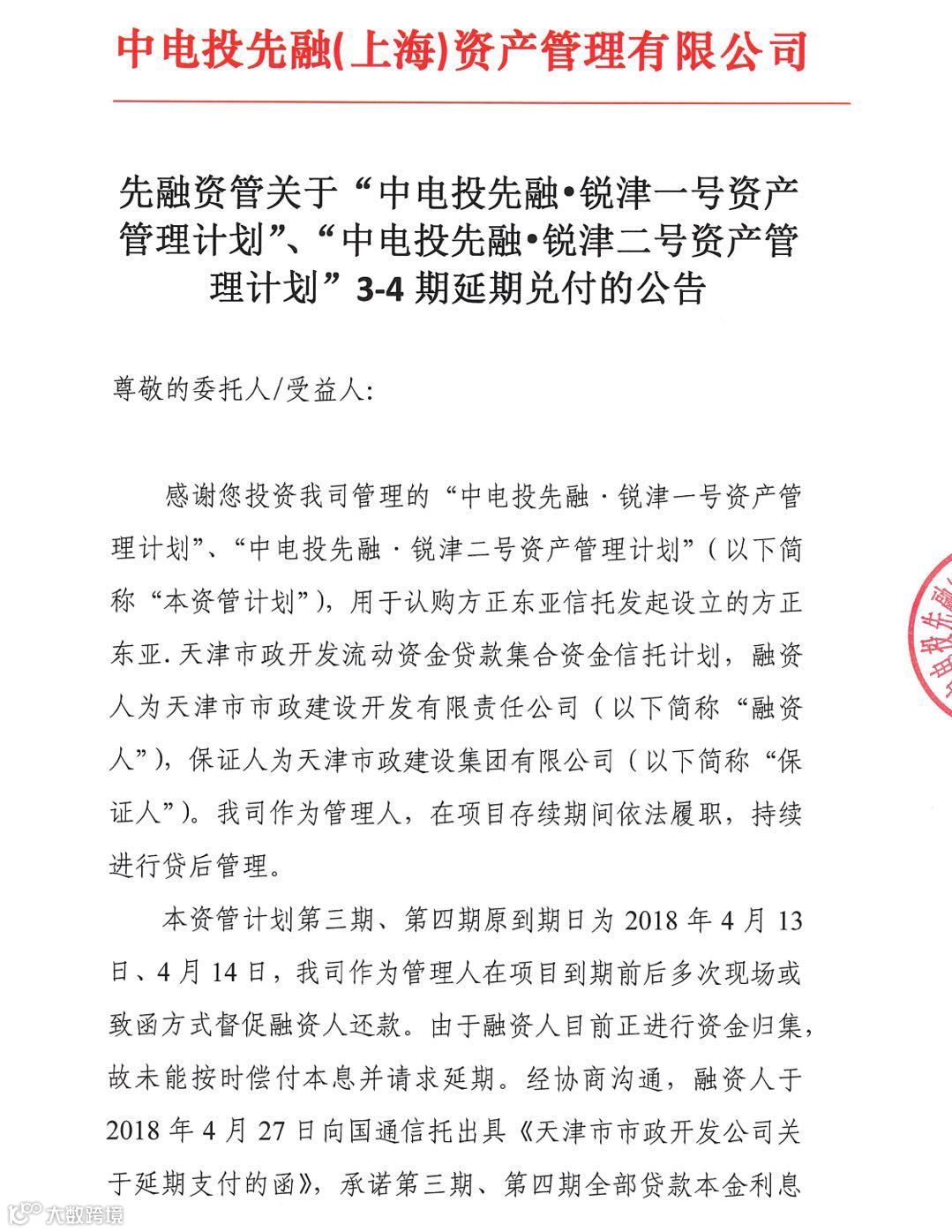 4月27日,中电投先融(上海)资产管理有限公司(简称“中电投先融”)发布公告,称旗下“中电投先融·锐津一号资产管理计划”、“电投先融·锐津二号资产管理计划”3—4期延期兑付。