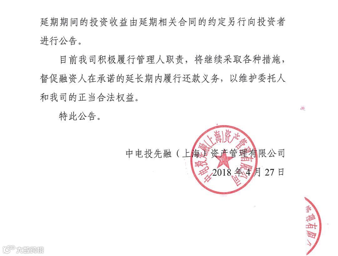 经过协商沟通后,融资人于4月27日向国通信托出具延期支付的函件,承若第三、四期全部贷款本金和利息将于2018年6月29日前全部清偿。
