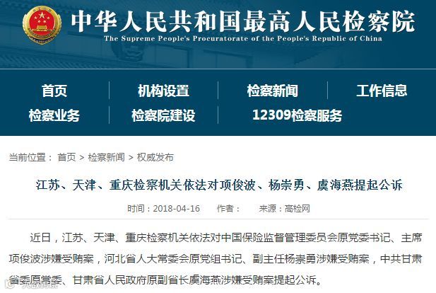 4月16日,最高检公布了中国保监会原党委书记、主席项俊波涉嫌受贿一案的最新进展——经最高人民检察院指定,由江苏省人民检察院侦查终结后移送江苏省常州市人民检察院审查起诉,江苏省常州市人民检察院近日已向江苏省常州市中级人民法院提起公诉。
