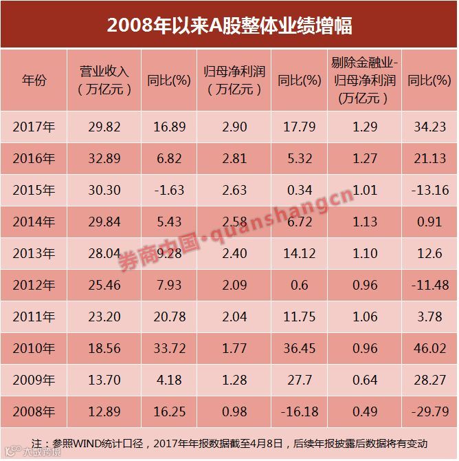纵向比较来看,如上述增幅如能保持,将成为2012年以来的最高营收增速,也是2011年以来的最高净利润增速。相较之下, 2016年A股整体营收为32.89万亿元、同比增幅6.82%,整体归母净利润2.81万亿元、同比增幅5.32%。