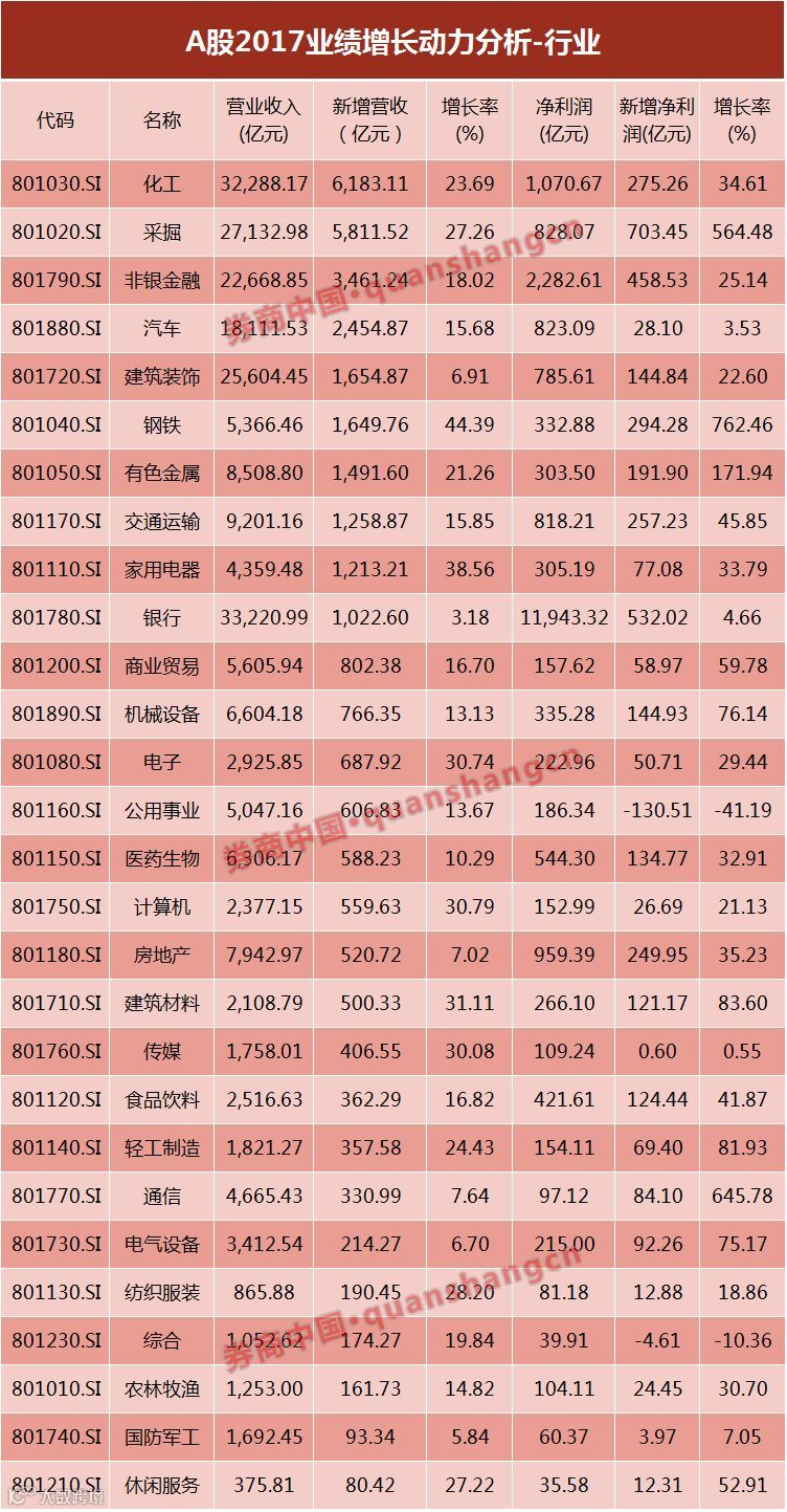 此外,推动A股净利润双位数增长的动力,主要来自采掘、银行和非银金融板块,分别在2017年新增净利润703.45亿元、532.02亿元和458.53亿元,增幅分别达到564.48%、4.66%和25.14%。
