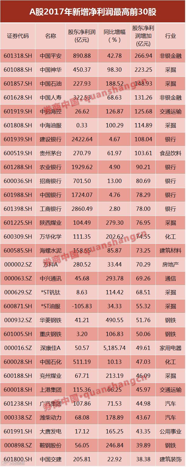 除此之外,还有5只个股在2017年为A股新增百亿净利润,包括中国石油(采掘)、中国人寿(非银金融)、中远海控(交通运输)、中海油服(采掘)、贵州茅台(食品饮料),分别增加股东净利润148.93亿元、131.26亿元、125.68亿元、114.89亿元和103.61亿元。
