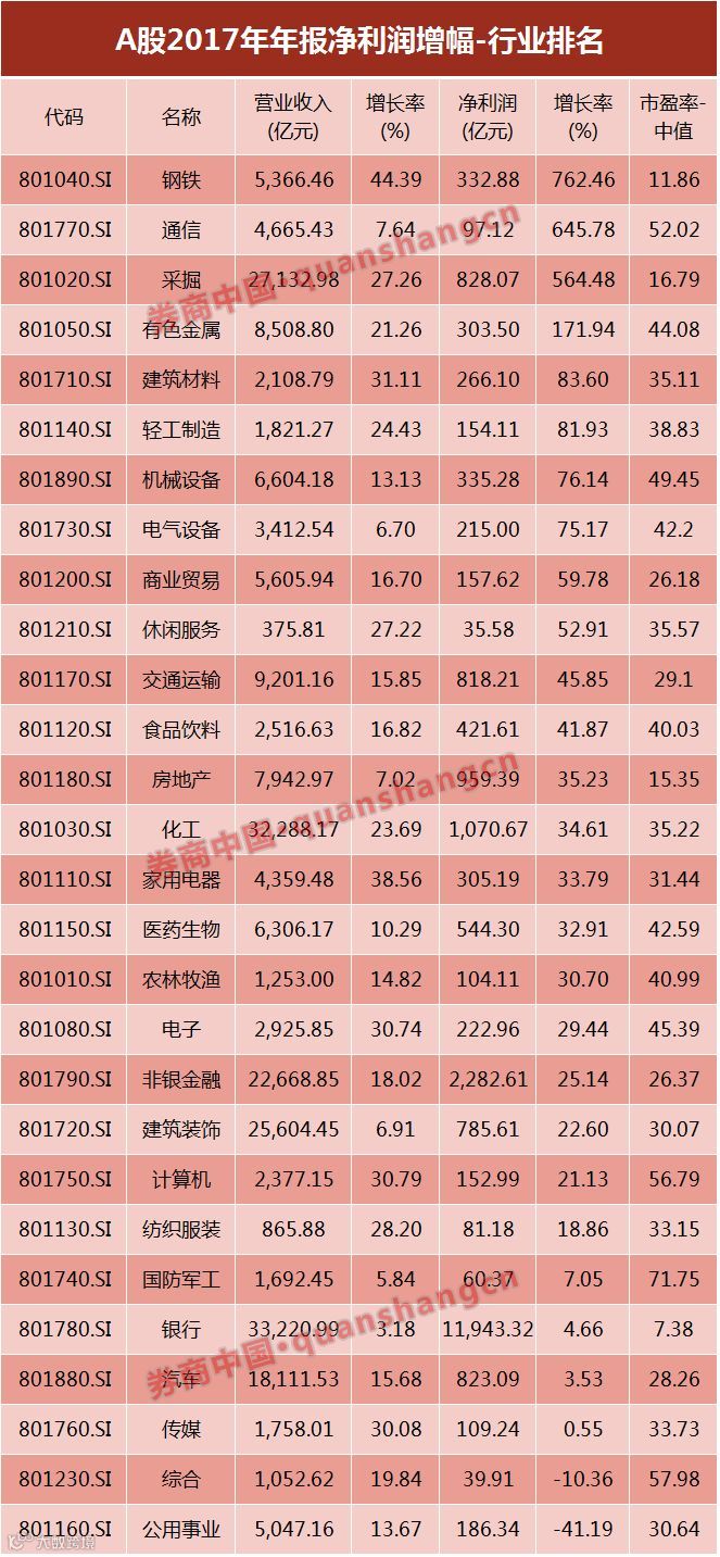 据券商中国记者统计,就目前披露数据来看,钢铁板块2017年共计实现营收5366.46亿元、同比增长44.39%,同时实现净利润332.88亿元,同比增长762.46%,二者均为A股第一。
