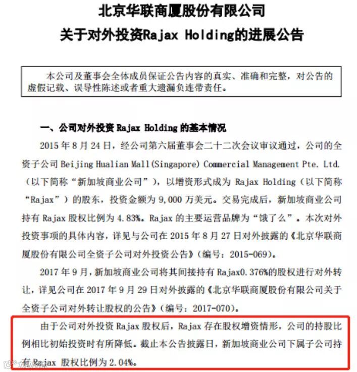 2015年8月,华联股份投资饿了么9000万美元;截至公告披露日,其相关公司持有饿了么母公司2.04%股权,交易对价为1.847亿美元。华联股份预计这次交易将带来税后约4.3~5.1 亿元人民币的一次性投资收益。