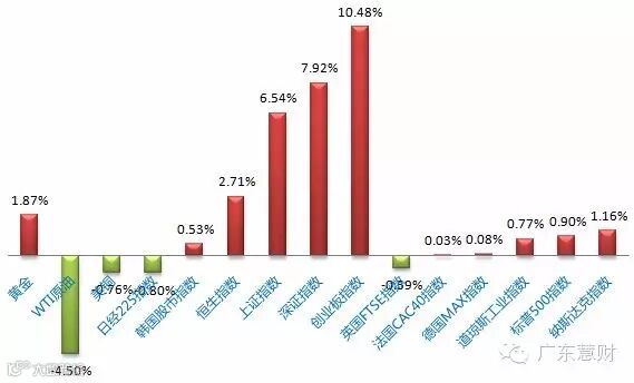 市场表现:欧美股市上周平安收官,亚洲(中国除外)及新兴市场反转势头减弱,中国股市延续上涨势头,周涨幅6.54%(沪指),创业板更是大涨10.48%,商品逆袭遇阻,原油大跌4.5%,黄金净买入涨1.87%,铜下跌。