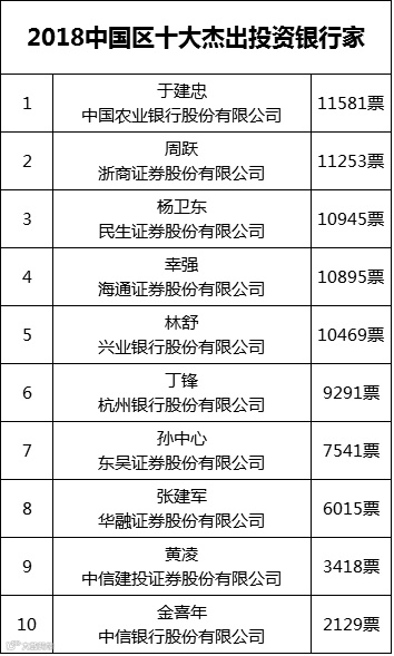最受关注的“2018中国区十大杰出投资银行家”,历年都是竞争最为激烈的,今年也不例外。目前投票数排在首位的是农业银行于建忠,高出最末公司9000多票,果然是“人家的人气”。