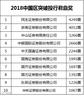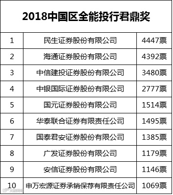 目前来看,“2018中国区全能投行君鼎奖”得票数排前五的分别是民生证券、海通证券、中信建投证券、中银国际证券和国元证券。排名第一的民生证券与排名最后的投票数,相差了100多倍。