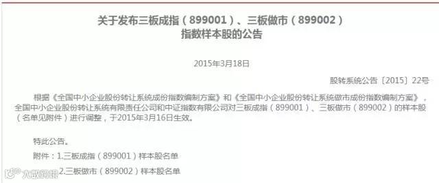 2014年1月12日,新三板信息披露系统正式上线。2015年3月18日,股转系统发布三板成指(899001)和做市指数(899002),标志着新三板进入指数时代。之后,股转系统多次调整和优化两大指数样本股,发布了指数编制细则,并就指数编制举行了投资者问答。
