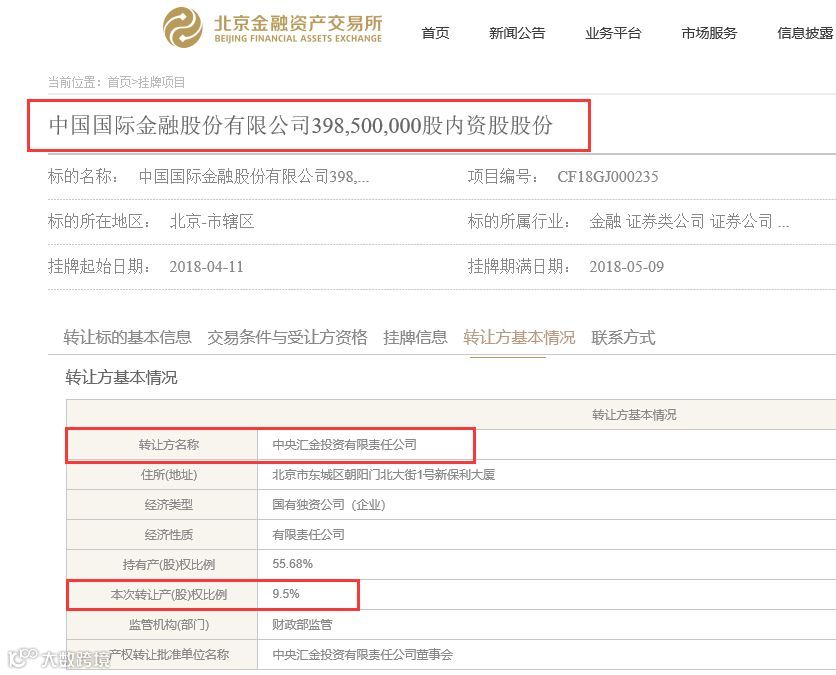券商中国记者查阅北京金融资产交易所网站发现,该网站首页的项目挂牌中“金融股权”今日(4月11日)列出了“中国国际金融股份有限公司3.985亿股内资股股份”信息,中央汇金投资有限责任公司为转让方。
