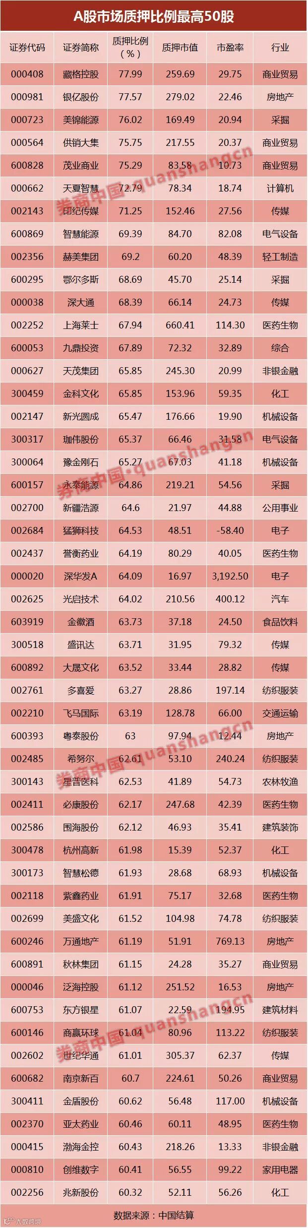 据券商中国记者统计,截至目前,两市共有138股的股权质押比例超过50%,有50股质押比例超过60%,藏格控股、银亿股份、美锦能源、供销大集、茂业商业、天夏智慧和印纪传媒等7股超过70%,这些公司后续都无法再办理新的质押业务。