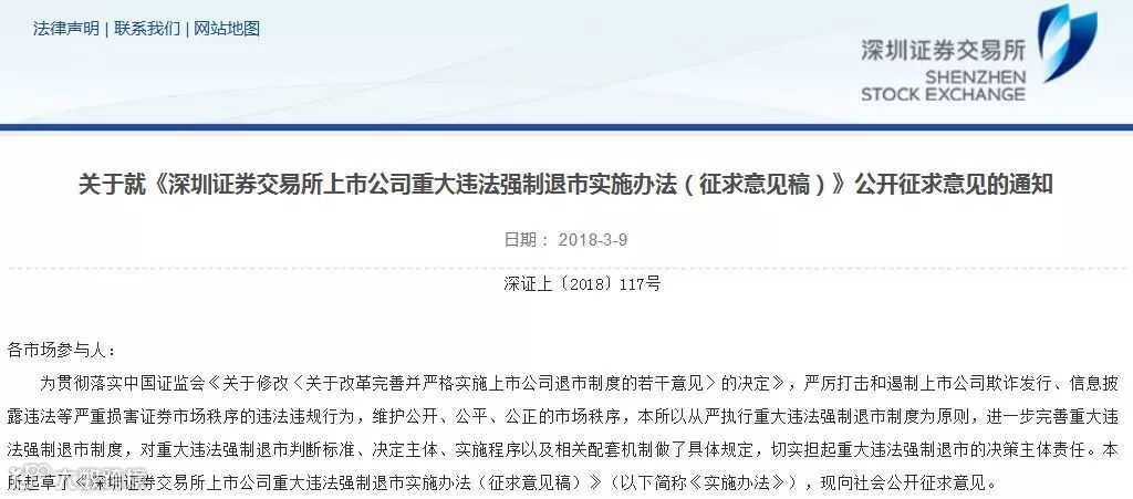 3月2日,证监会发布的修改《关于改革完善并严格实施上市公司退市制度的若干意见》公开征求意见中,明确要求强化交易所退市主体责任,制定重大违法退市实施规则。