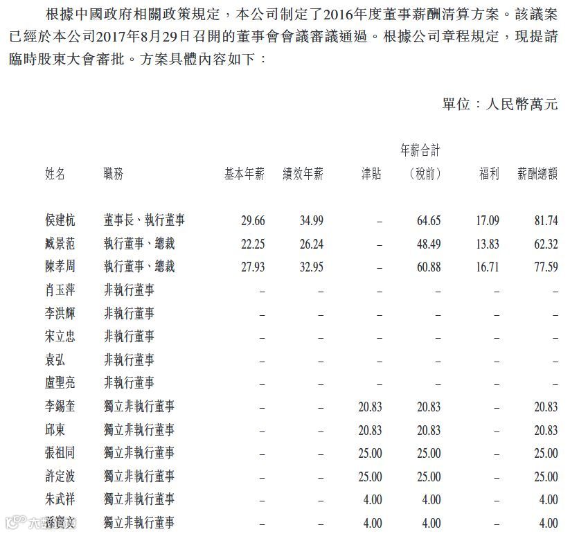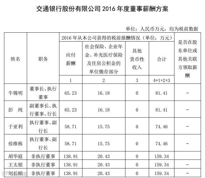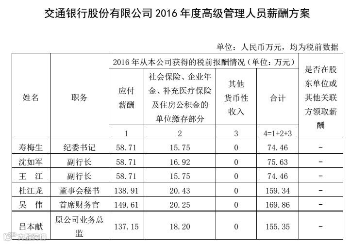 交通银行首席财务官吴伟、原董事会秘书杜江龙、原公司业务总监吕本献2016年税前报酬分别为169.86万元、159.34万元和155.35万元,在主要高管中薪酬排名第四、五、六位,不过杜江龙已于去年10月辞职,吕本献则在2016年10月辞职,转任中民投副总裁。