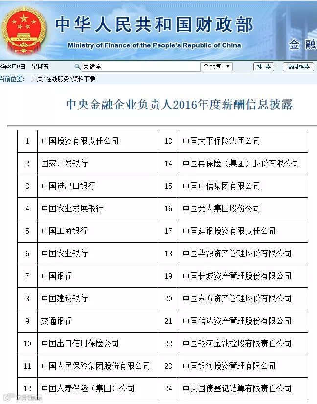 近日,财政部在官网公布了《中央金融企业负责人2016年度薪酬信息披露》,包括中投公司、三家政策性银行、五大行等24家中央金融企业2016年高管薪酬情况。