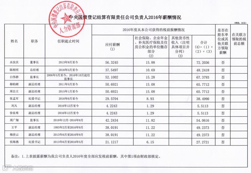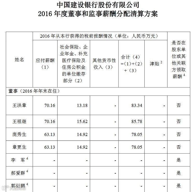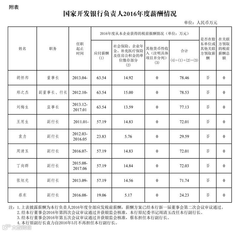 国家开发银行主要高管2016年度税前薪酬均处于70-80万元区间,整体水平较2015年高出约5万元;
