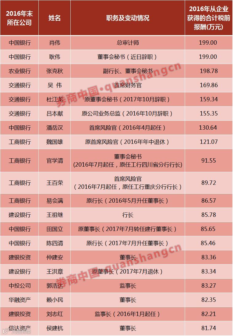 统计数据显示,薪酬最高的是中国银行的总审计师肖伟、近日因工作变动辞职的董事会秘书耿伟,他们2016年的税前报酬均为199万元。