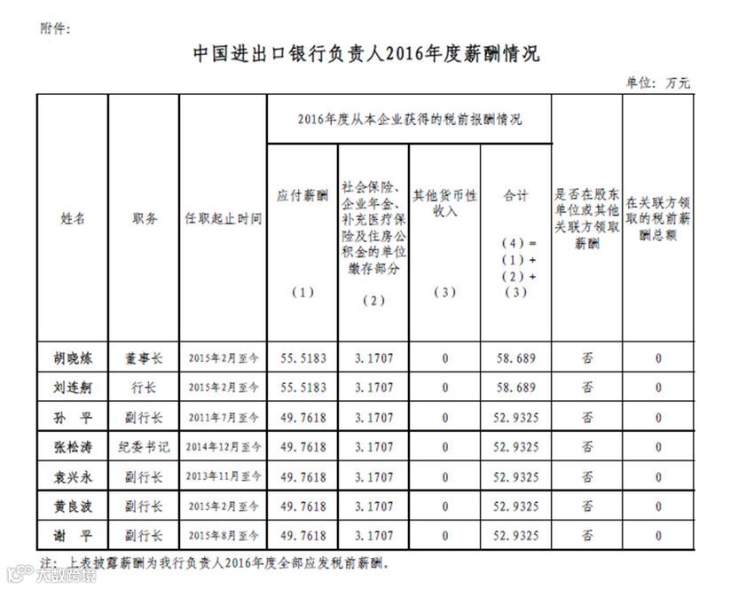 进出口银行主要高管2016年度税前薪酬均处于50-60万元区间,整体水平稍稍高于2015年,增幅约2万元。