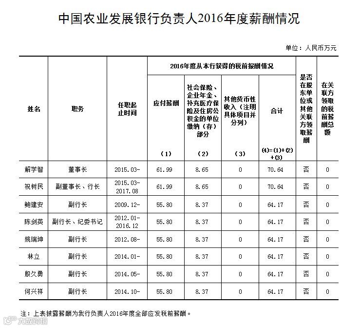 农业发展银行主要高管2016年度税前薪酬均处于60-70万元区间,整体水平稍稍高于2015年,增幅约3万元;