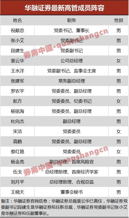 “华融证券内部已下发OA通知,张小艾担任华融证券党委副书记。他还将拟任华融证券副董事长,兼任华融瑞泽董事长,相关职务还有待监管部门审批、集团公司(中国华融)批准和公司内部治理程序通过。”接近华融证券的一位权威知情人士向券商中国记者透露。