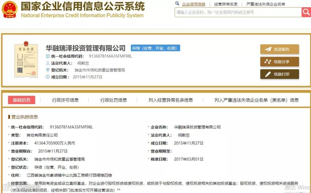 就在去年3月1日,华融瑞泽完成增资,注册资金由15000万元增至41364.7059万元。华融证券注册资本出资额38364.7059万元,占92.7474%。江西瑞金市城市发展投资集团有限公司出资额3000万,占7.2526%。