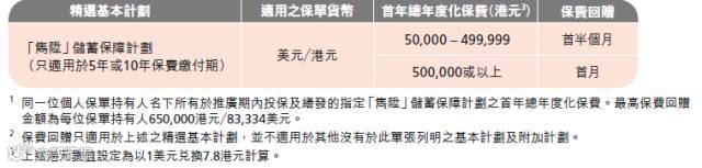 客户凡于推广期期间成功投保5年或10年保费缴付期「隽升」储蓄保障计划而首年总年度化保费达到以下指定金额,可享高达650,000 港元保费回赠。