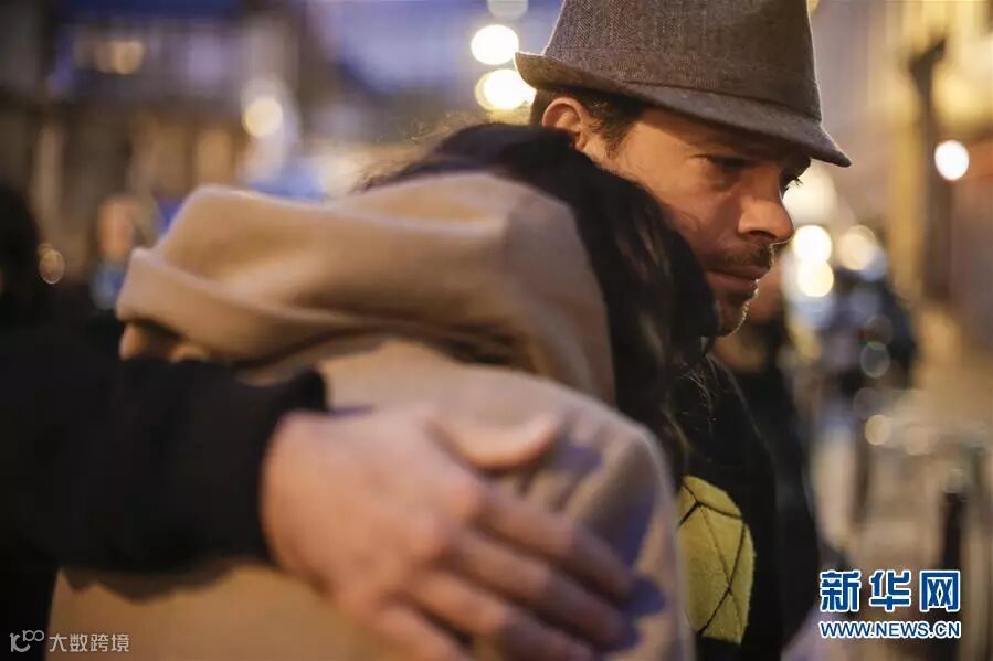 11月14日,在法国巴黎发生袭击事件的餐馆外,一对前来悼念的情侣为死难者落泪。