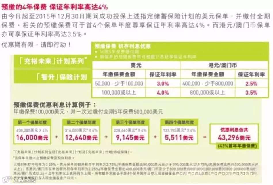 优惠内容:现凡于2015年10月30日至12月30日内成功投保推广产品的5年保费缴付期,年缴保费达50000——少于100000美元可保证年利率为3%,年缴保费100000美元或以上可保证年利率为4%。若以港元/澳门币缴纳保费在40万——少于80万可保证年利率为2.5%,80万或以上可保证年利率为3.5%。所以,购买美元保单相对来说更划算!