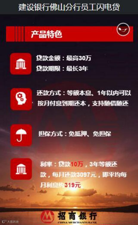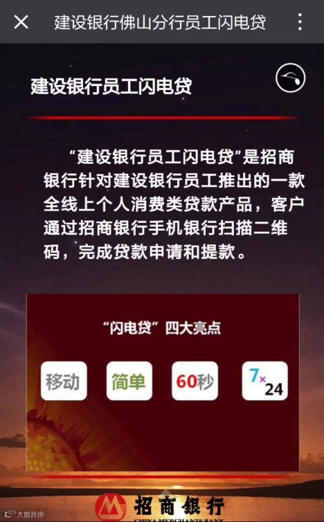 首先,刷屏的图片已经说的很清晰了,招商银行针对建行佛山分行的员工,推出了一款专属全线上个人消费类贷款产品——“建行员工闪电贷”。说是专属,但其实绝对不算,因为招行闪电贷早在2015年就已经正式以“白名单”形式上线了。