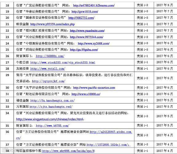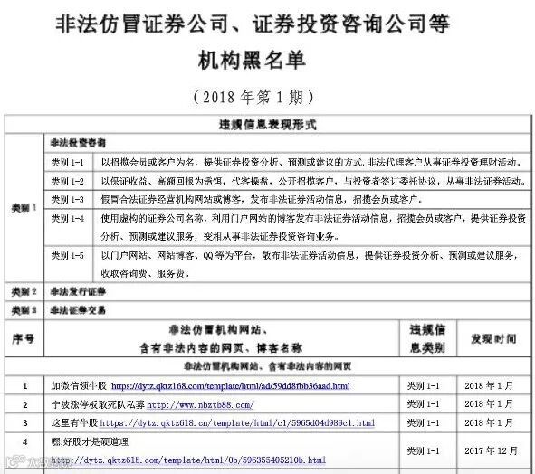 《非法仿冒证券公司、证券投资咨询公司等机构黑名单(2018年第1期 )》显示,仿冒证券公司及证券公司营业部网站的情况较多,与广发证券、华泰证券等公司长相相似的“李鬼”,被揪出来曝了光;名称为“宁波涨停敢死队私募”、“涨停板敢死队”等网站为非法网站。