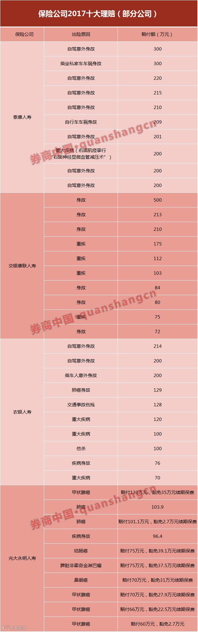 泰康人寿筛选出的十大赔案显示,十大赔案中除了一例是重大疾病导致的赔付,其余9起全部是交通意外事故导致。在农银人寿的十大赔案中也有4起是交通事故导致。