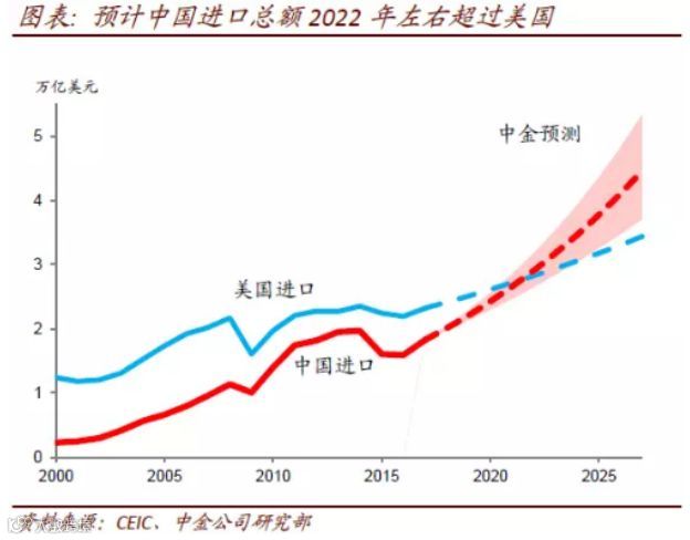 过去十年,中国进口年均增速比美国快6个百分点左右。中金公司预计,在基准情形下,我们假定2018年中美进口增速仍相差6个百分点,之后每年缩小0.15个百分点,那么中国将在2022年超过美国成为全球第一大进口国。保守情形下,如果中美进口增速差从4个百分点开始递减,中国将在2025年成为全球第一大进口国。