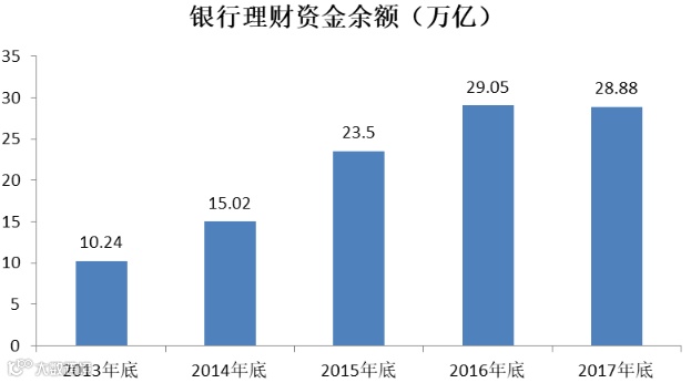 根据普益标准数据监测统计结果,截至 2017 年 12月底,全国共有 476 家银行业金融机构(不包括外资银行)有存续的理财产品,理财产品数 122290只,年内增速居于高位;而存续规模估计为28.88万亿,较年初的规模29.05万亿减少0.17万亿。银监会在2017年10月14日发布的数据显示,银行理财产品增速连续8个月下降。