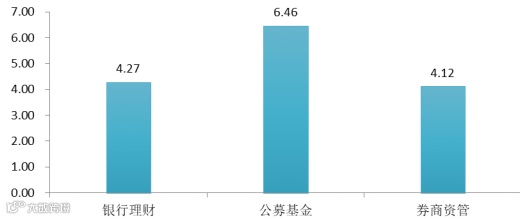 截至2017年12月,银行发行的净值型理财产品平均年化收益率为4.27%;公募基金产品年化收益率为6.46%;券商资管型产品年化收益率为4.12%。