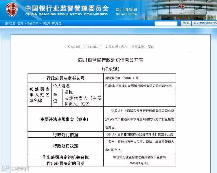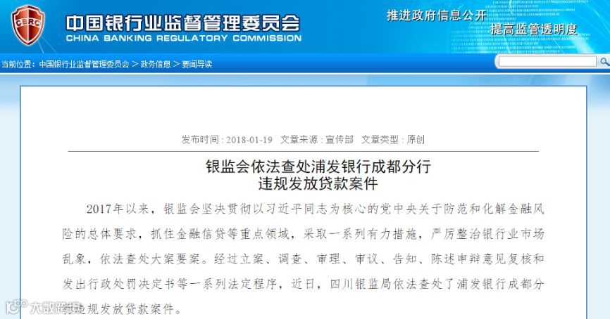 针对银监会处罚,浦发银行当日(1月19日)晚发了关于成都分行处罚事项的公告,主要回应事项如下: