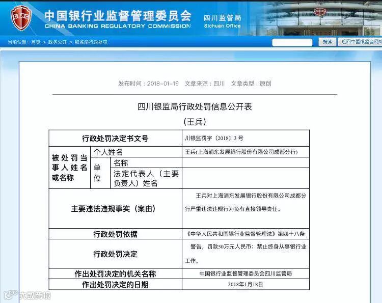 1月19日,银监会公布依法查处浦发银行成都分行违规发放贷款案件。四川银监局公布对浦发银行成都分行案做出处罚,共罚没4.62亿元,原浦发成都分行行长王兵被“双开”。