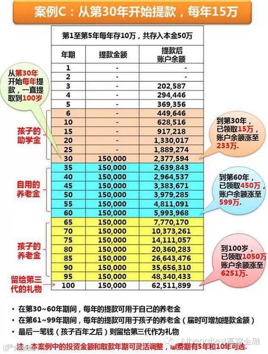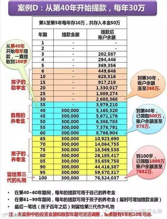 5年共投入本金500万元,从第30年开始每年取款180万元直至100岁
