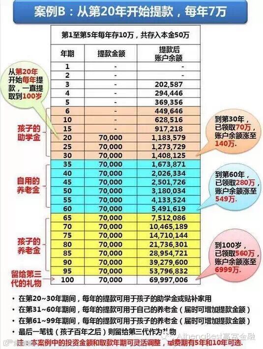 5年共投入本金50万元,从第20年开始每年取款7万元直至100岁
