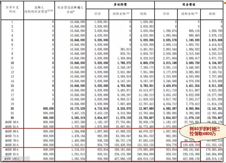 5年共投入本金500万元,从第20年开始每年取款80万元直至100岁