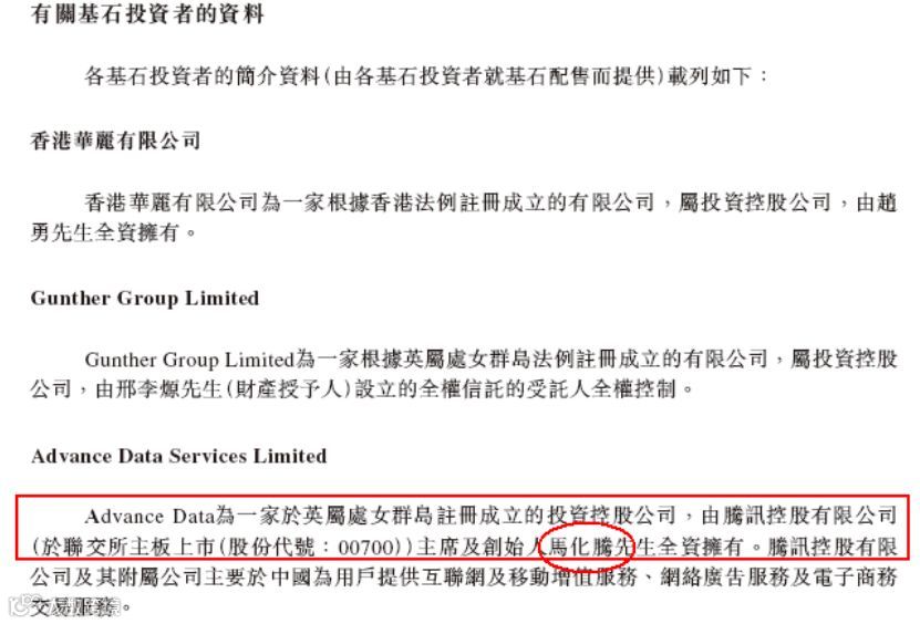 值得注意的是,3名基石投资者分别为香港华丽有限公司、Gunther Group Limited 及Advance Data Services Limited。其中,Advance Data由腾讯控股有限公司主席及创始人马化腾全资拥有。