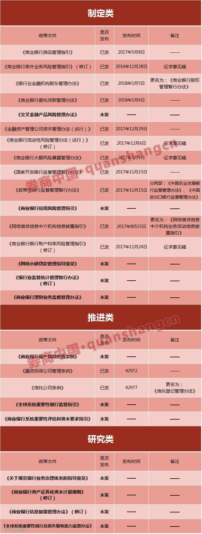 券商中国记者根据2017年初银监会公布的“弥补银行业监管制度短板工作项目”梳理发现,截至目前,仍有不少政策尚未出台,而这些也将是2018年的监管政策重点。
